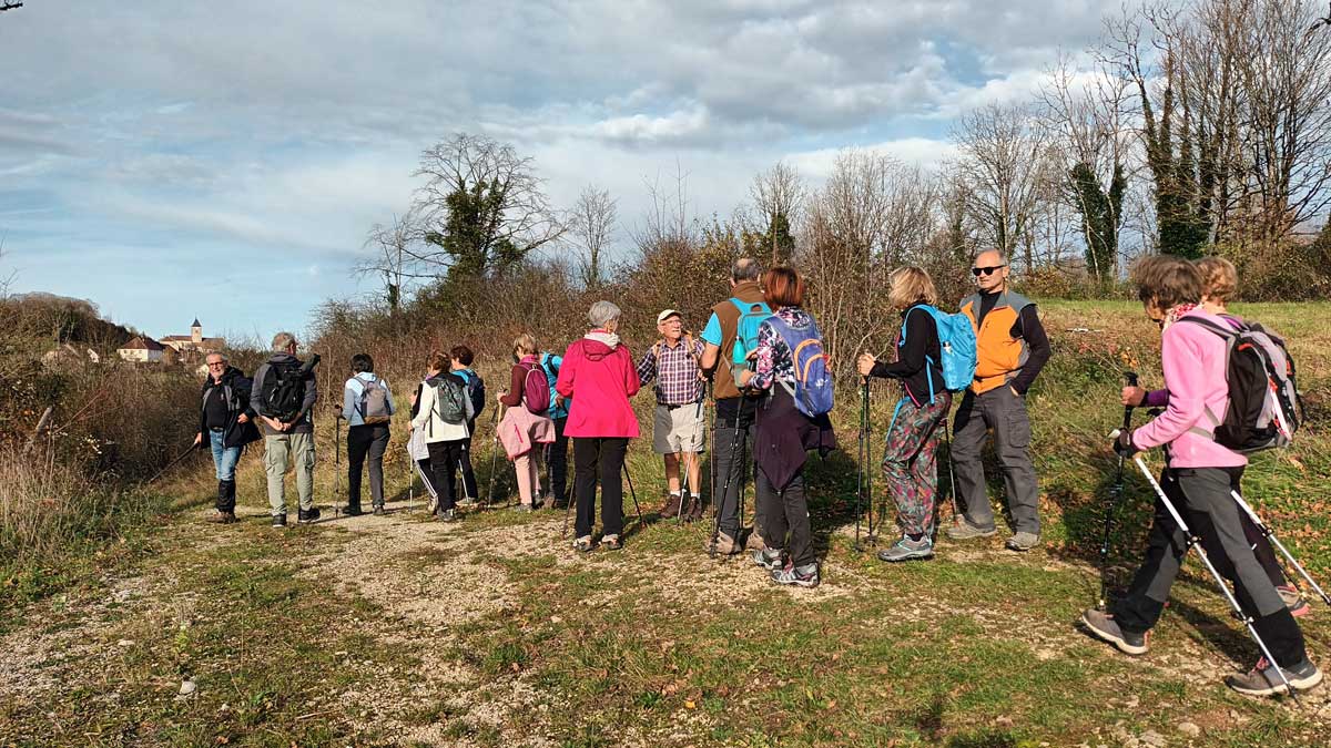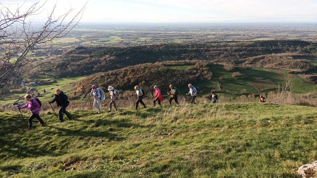 Quelle belle journée et quel beau site que celui de St-Laurent la roche pour randonner ! Du soleil, un peu de vent du sud, des sentiers tapissés de feuilles sèches, une succession de montées et de descentes, 25 randonneurs motivés et heureux de faire cette grande boucle autour du village et, depuis les belvédères, d'admirer notre beau Revermont surplombant une multitude de villages bressans au loin.
