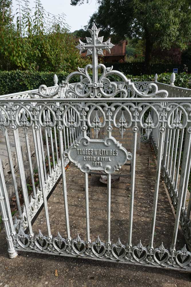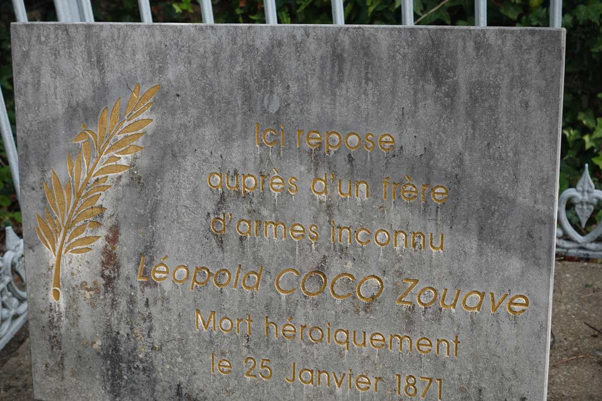 Après avoir contourné l'enceinte du château , nous sommes passés devant le rucher un peu spécial et le champ de cyclamens pour arriver à la tour du Zouave Coco. Quelques photographies plus tard, nous avons repris la route pour descendre dans les vignes et revenir à Montigny lès Arsures pour nous recueillir sur la tombe de Léopold Coco.