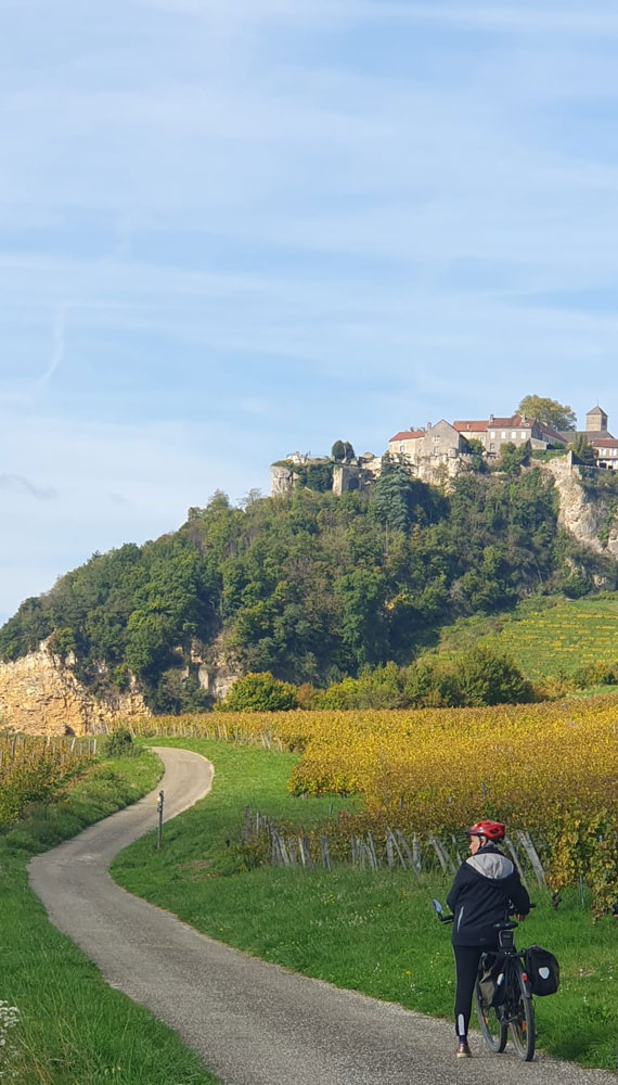 C'est un spectacle qu'il ne faut pas rater , d'autant plus que les vignes ne sont pas plantées en lignes symétriques et rigides mais de façon très poétique et esthétique. Nous avons profité à plusieurs reprises de la vue imprenable sur Château-Chalon la merveilleuse. Ainsi des champs de colza d'hiver d'un jaune éclatant l'ont mise en valeur.